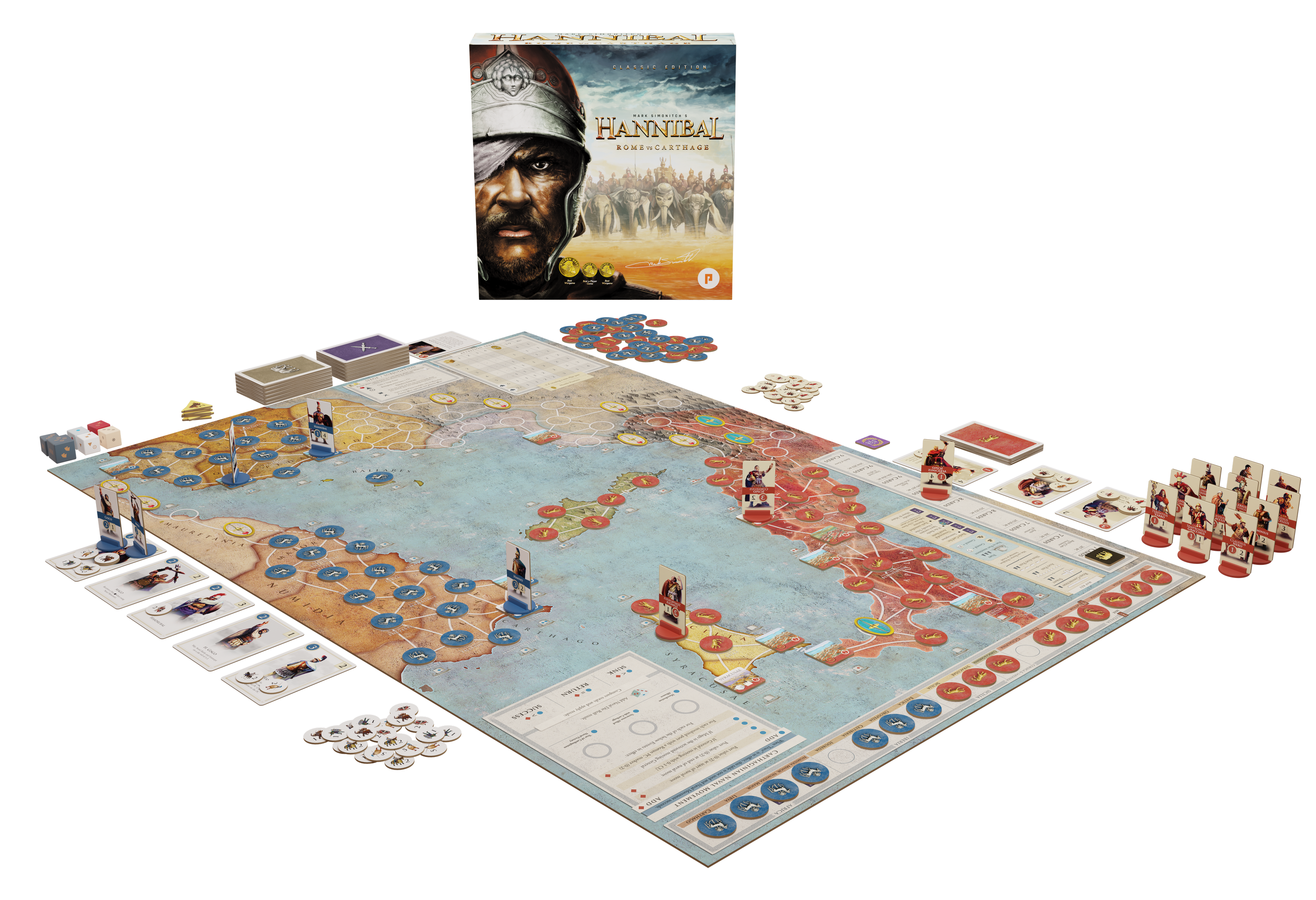 Hannibal is an award-winning asymmetrical card-driven wargame with rules and cards upgraded from previous editions. Use Strategy Cards to maneuver armies and famous generals of the time, raise new troops, gain political control of provinces and regions across the Mediterranean, and play powerful historical events. Achieve victory by capturing your enemy’s capital, holding more provinces at the last round or by removing all your opponent’s PC markers from the map.